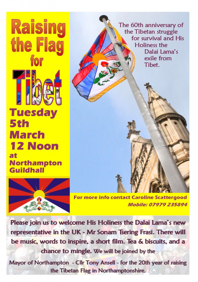 Tibetan Flag Flies over Northampton In 2002, with the support of the Northampton Women’s Forum, Northampton Borough Council awarded a Tibetan Nun Honorary Citizenship of Northampton while she was languishing in a Tibetan prison. It was accepted by His Holiness the Dalai Lama’s Representative Mrs Kelsang Takla on her behalf and one year later she was free. During the years Caroline has also seen the flag waving proudly over Althorpe (at the invitation of Earl Spencer) and over Castle Ashby together with Lord Northampton. But it is at the Guildhall each year that Mayors and Dignitaries of all parties have shown their support of the Tibetan people who are still struggling under the dominance of China. This year, on Monday 5th March, the snows had melted, the sun shone and Caroline Scattergood, the Mayor of Northampton Councillor Gareth Eales, the Leader of Northampton Borough Council Cllr Jonathan Nunn and the Deputy Leader Cllr Phil Larratt stood together with the Dalai Lama’s Representative Chonpel Tsering to fly the flag for this, the nineteenth year. The Guildhall was packed with supporters, many of whom had travelled from various parts of the country to join together with Councillors, business people, friends and supporters, and many members of the original Women’s Forum. A tribute was paid to the late member Linda Brede and a very special welcome was given to Fran Wire the widow of ex-Mayor Terry Wire. Although she wasn’t free to attend, Joanna Lumley sent a message to be read out by her chum Caroline Scattergood which contained a wonderful philosophy in these hard times “The pendulum always swings wildly at times of change and soon the world will stop being SO MAD”. |